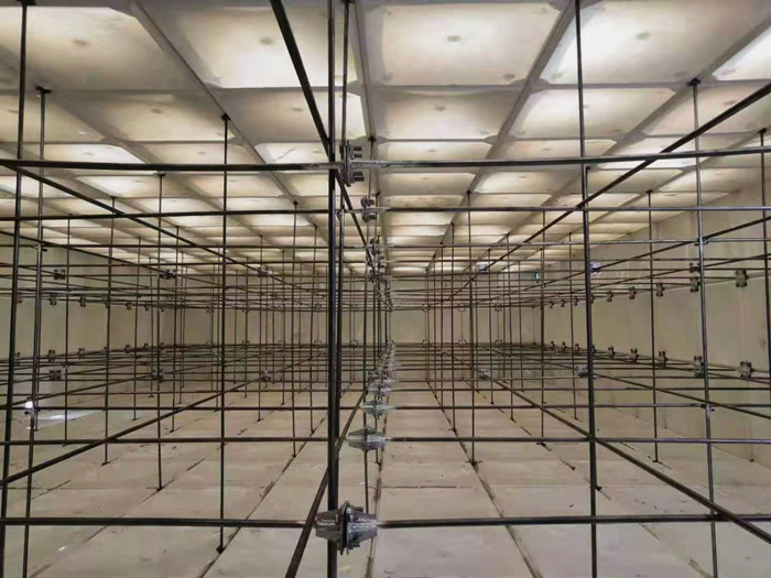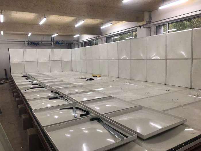 焊接玻璃鋼水箱底板,焊縫均勻整齊,不得有氣泡、焊坑,在底板上組裝點焊玻璃鋼水箱下側板四周,組裝前按圖紙要求選定相應板厚的模塊,將模塊四周折邊敲正校平。先將下側板點焊于底板四周,點好后測量四周方框的兩條對角線長度誤差不得大于2mm,要已點焊后的下側模塊整體橫平豎直組合方正。